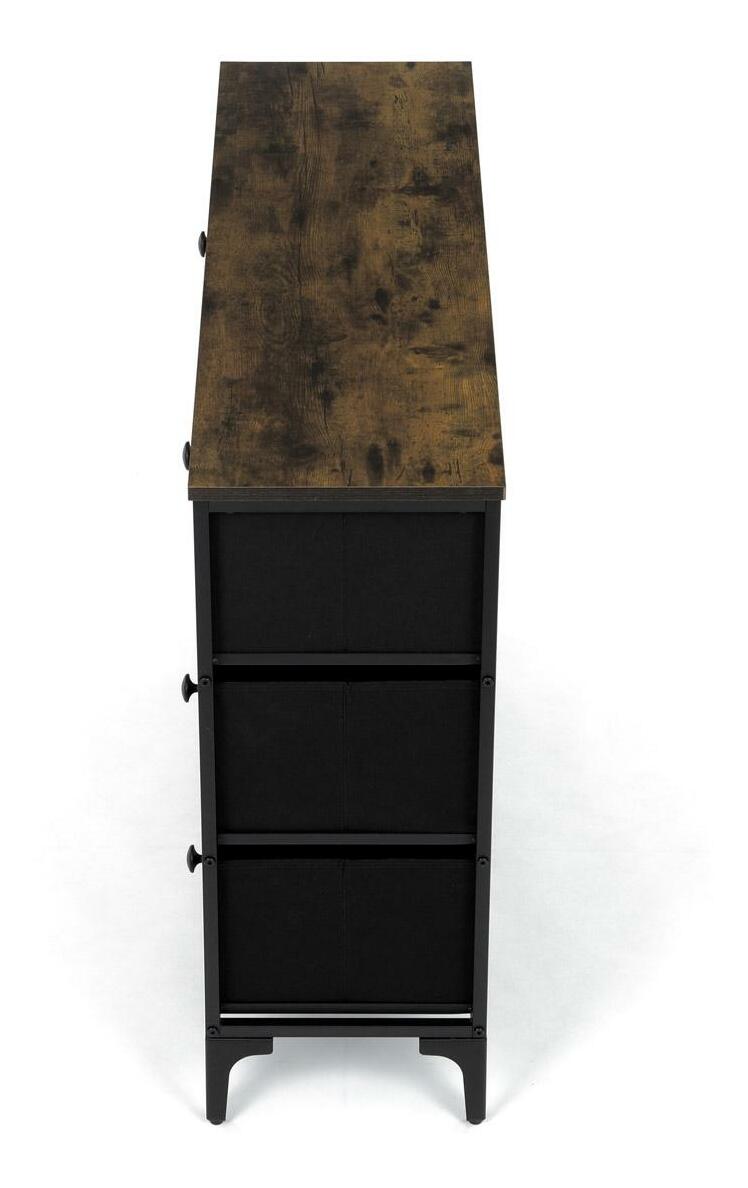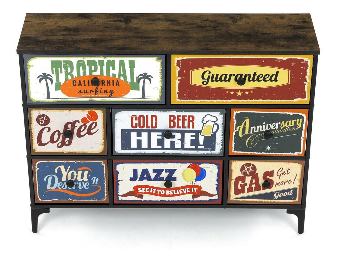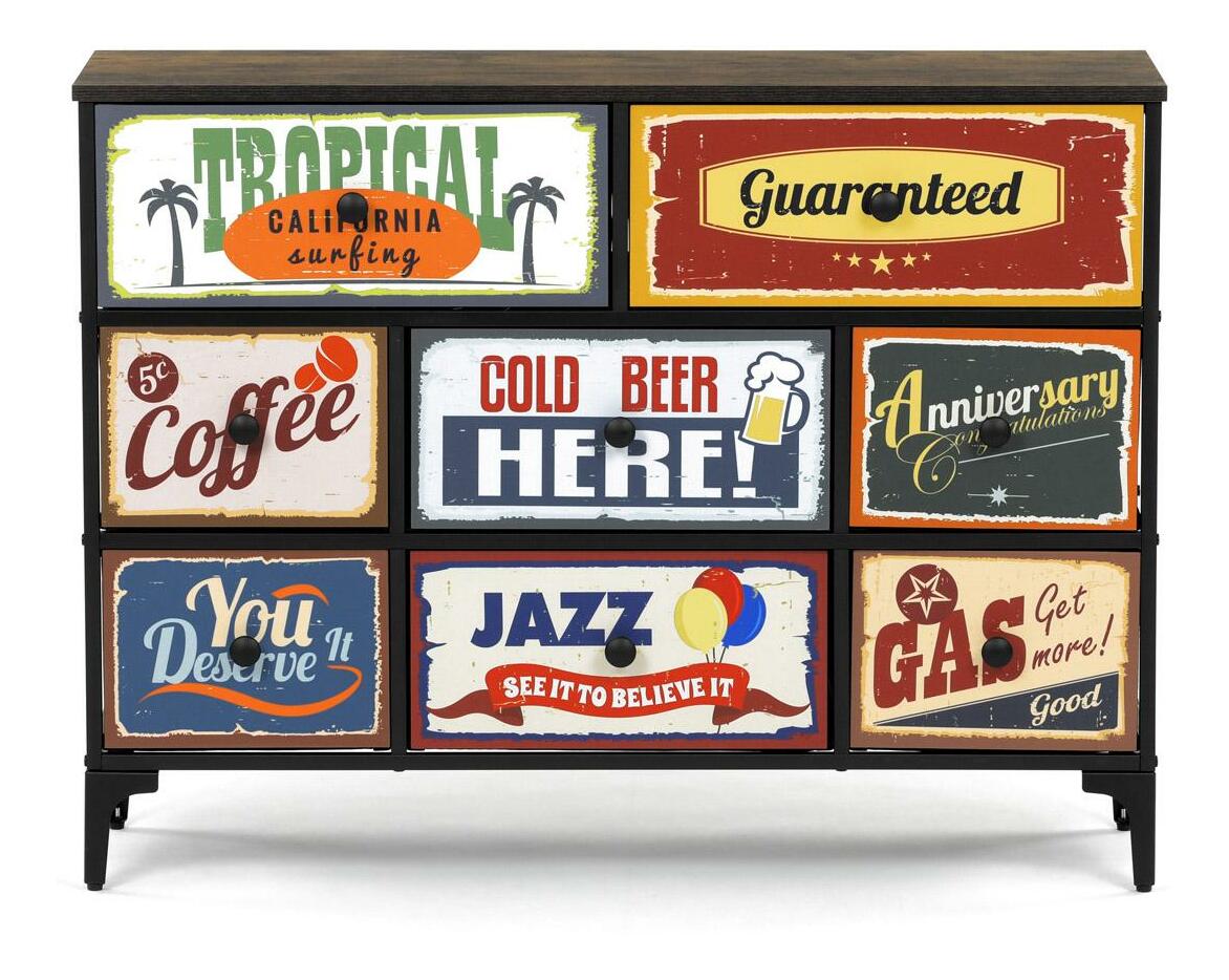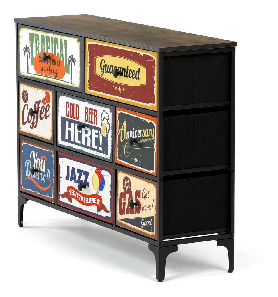 Retro komoda přinese do vašeho interiéru jedinečný styl a originalitu. Textilní čela zásuvek s výplní HDF a vintage potiskem navozují atmosféru starých amerických barů a jazzových klubů. Kombinace černé kovové konstrukce, prkna v dekoru starého dřeva a ozdobných nohou dodává nábytku robustní, ale zároveň elegantní vzhled. Korpus zásuvek je vyroben z netkané textilie s výplní HDF, což zajišťuje jejich lehkost a snadnou manipulaci. Ideální doplněk do obývacího pokoje nebo stylové kavárny, kde se stane nepřehlédnutelným prvkem.