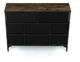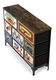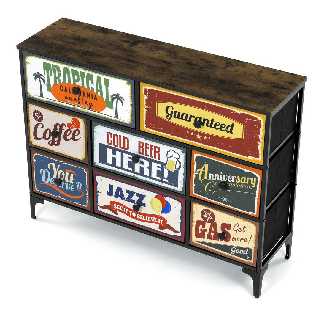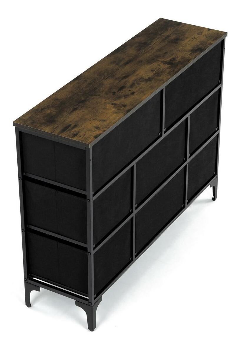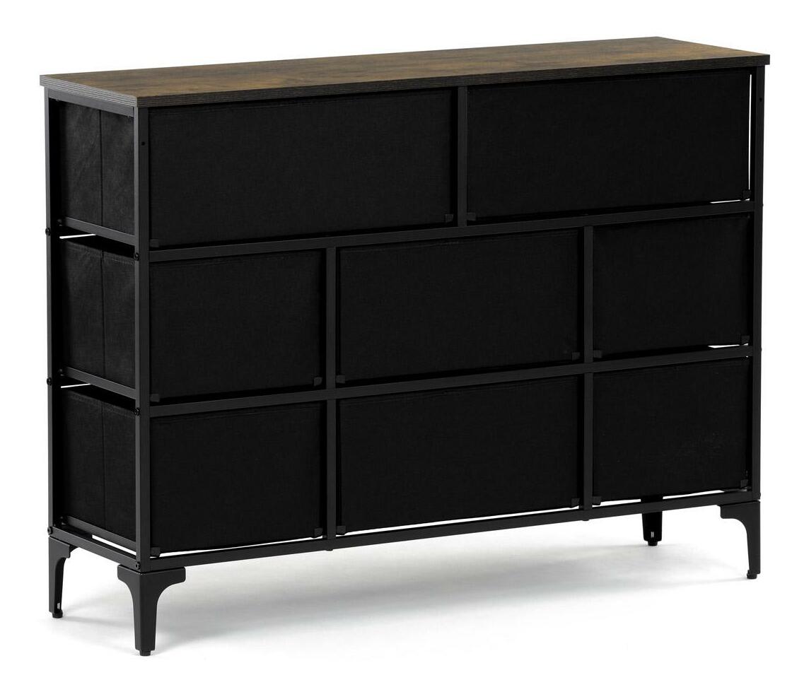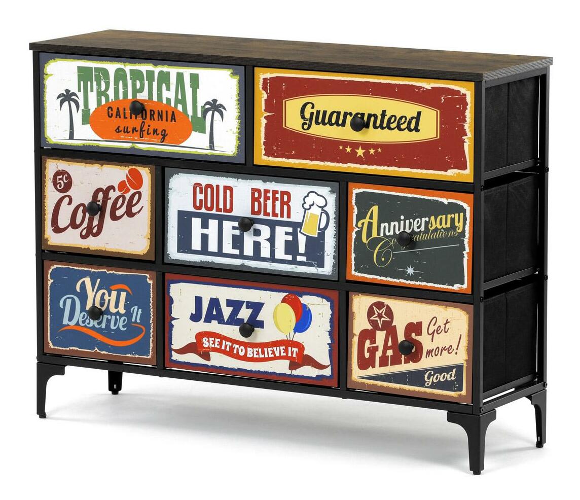 Retro komoda přinese do vašeho interiéru jedinečný styl a originalitu. Textilní čela zásuvek s výplní HDF a vintage potiskem navozují atmosféru starých amerických barů a jazzových klubů. Kombinace černé kovové konstrukce, prkna v dekoru starého dřeva a ozdobných nohou dodává nábytku robustní, ale zároveň elegantní vzhled. Korpus zásuvek je vyroben z netkané textilie s výplní HDF, což zajišťuje jejich lehkost a snadnou manipulaci. Ideální doplněk do obývacího pokoje nebo stylové kavárny, kde se stane nepřehlédnutelným prvkem.