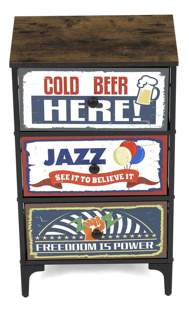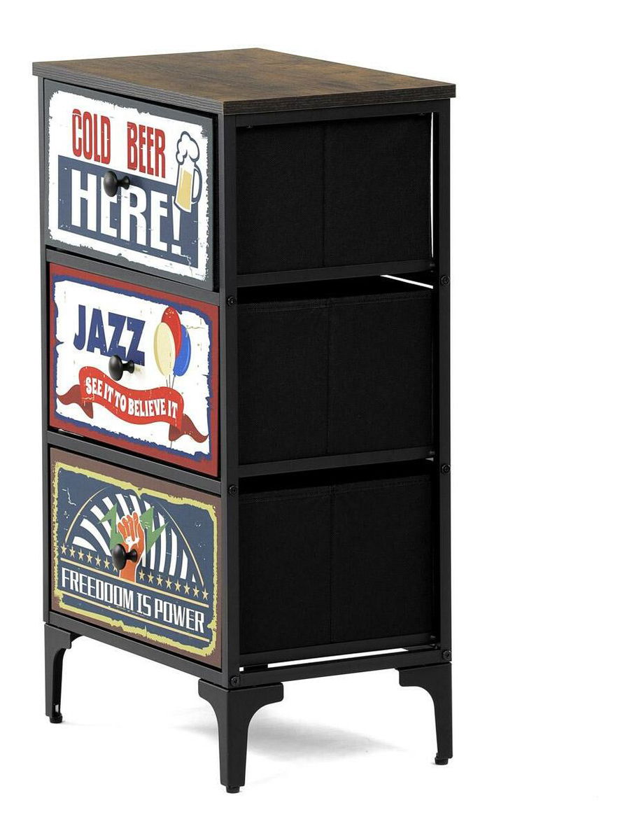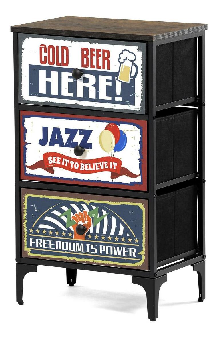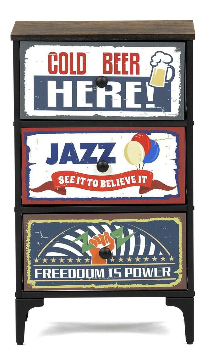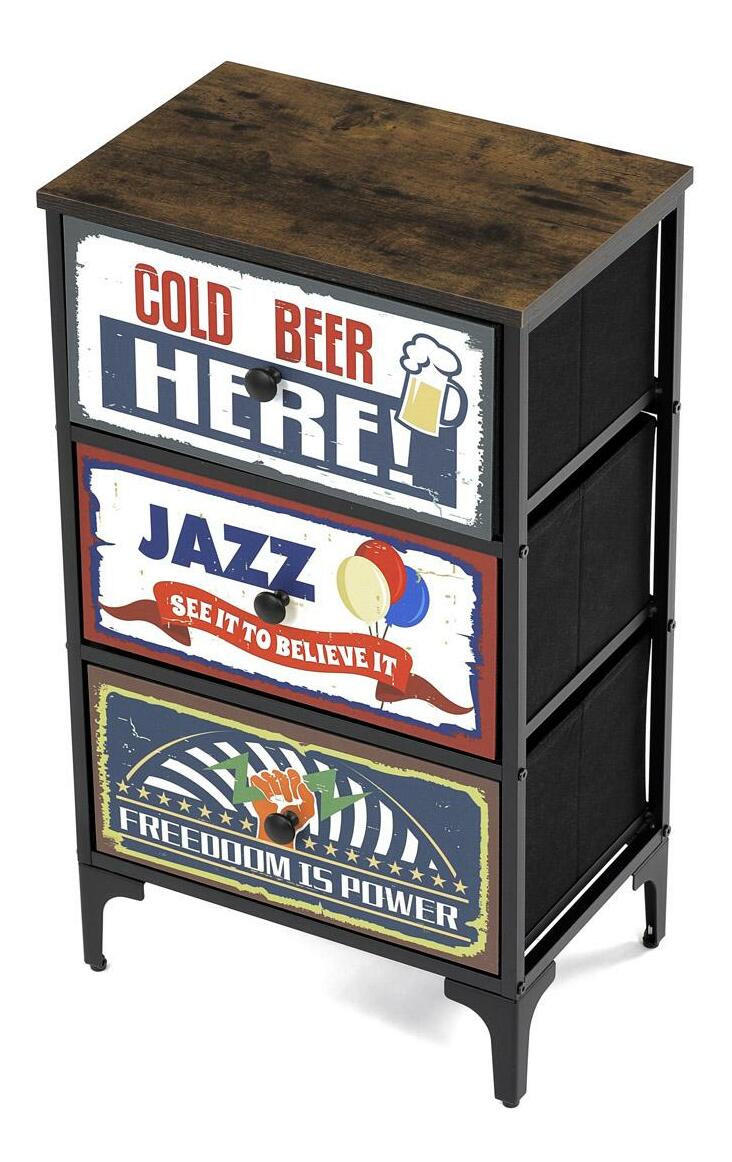 Retro komoda přinese do vašeho interiéru jedinečný styl a originalitu. Textilní čela zásuvek s výplní HDF a vintage potiskem navozují atmosféru starých amerických barů a jazzových klubů. Kombinace černé kovové konstrukce, prkna v dekoru starého dřeva a ozdobných nohou dodává nábytku robustní, ale zároveň elegantní vzhled. Korpus zásuvek je vyroben z netkané textilie s výplní HDF, což zajišťuje jejich lehkost a snadnou manipulaci. Ideální doplněk do obývacího pokoje nebo stylové kavárny, kde se stane nepřehlédnutelným prvkem.