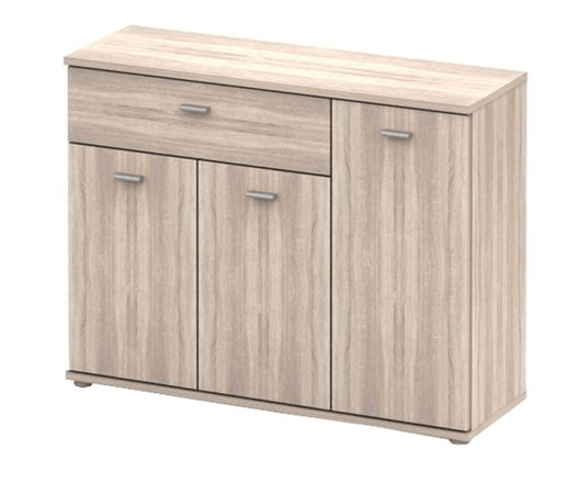 Univerzální komoda s jednou zásuvkou umístěnou v levém rohu se třemi dvířky, kterou je možné umístit do více typů místností a umí zastávat několik úložné role. Materiál je DTD laminovaná, barevné provedení je dub sonoma, uvnitř za dvířky se nachází jedna polička.