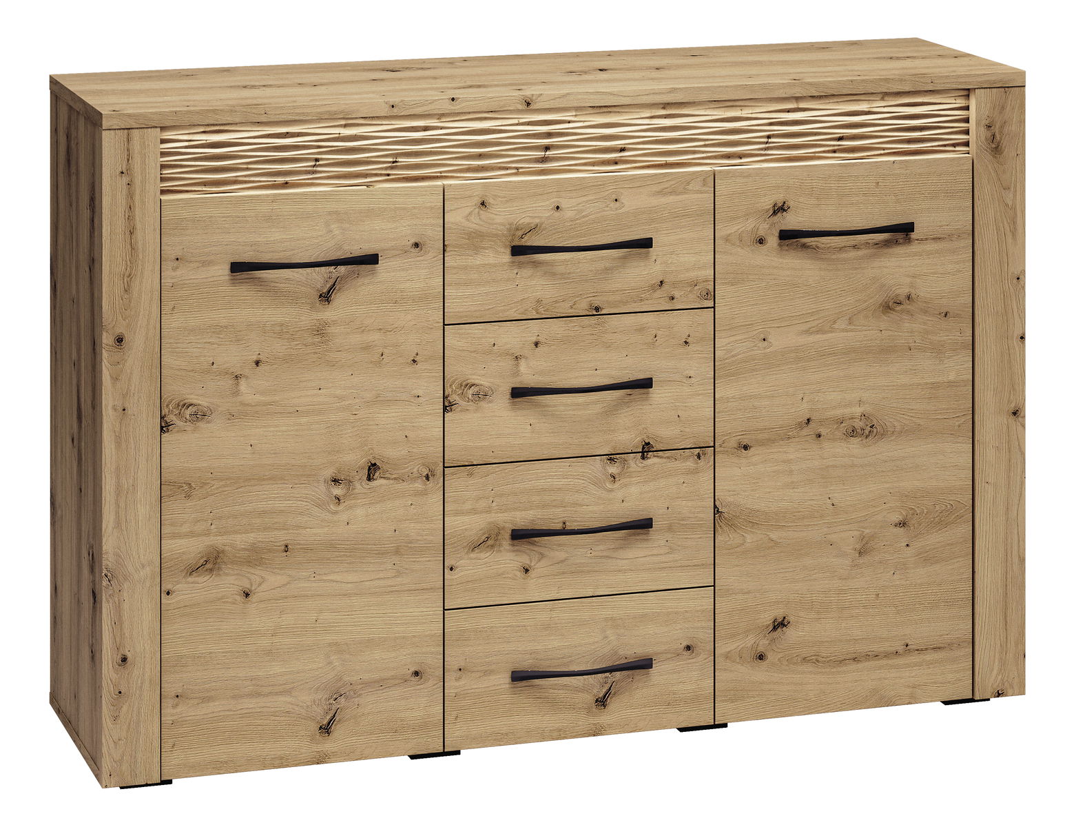 Komoda Anika 7 disponuje jednou zásuvkou, která umožňuje plný výsuv a čtyřmi dvířky. Dvířka disponují systémem bezúchytového otevírání. Vrchní deska je speciálně zesílená a můžete ji využít jako dodatečný výstavní prostor pro různé dekorace. Barevné provedení je přitažlivé ve stylu přírodního dekoru dubu artisan. Zásuvky jsou osazeny na kvalitních kolejničkách.