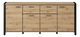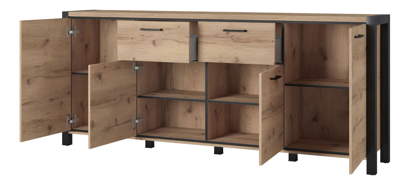 Široká komoda Armin je vhodná nejen do obývákové sestavy, ale také na chodbu. Komoda se skládá ze dvou prostornějších zásuvek umístěných v horní části uprostřed a čtyř skříněk s plnými dvířky. Uvnitř se nacházejí poličky. Tato komoda má všestranné využití. Komoda je vyhotovena v příjemném dřevěném dekoru dub taurus s elegantním černým orámováním a nožičkami. Úchytky dvířek a zásuvek jsou úzké a také v černém provedení.