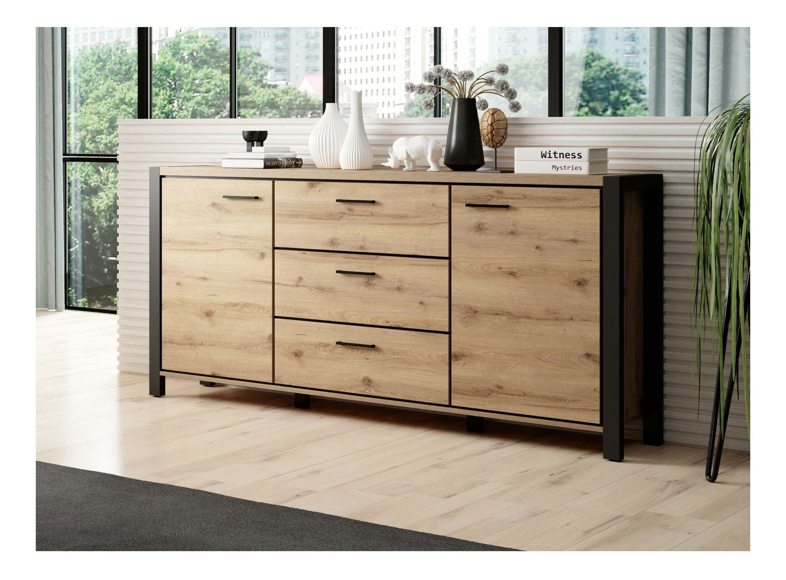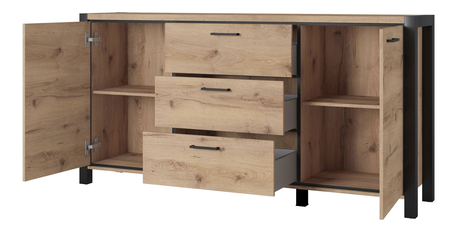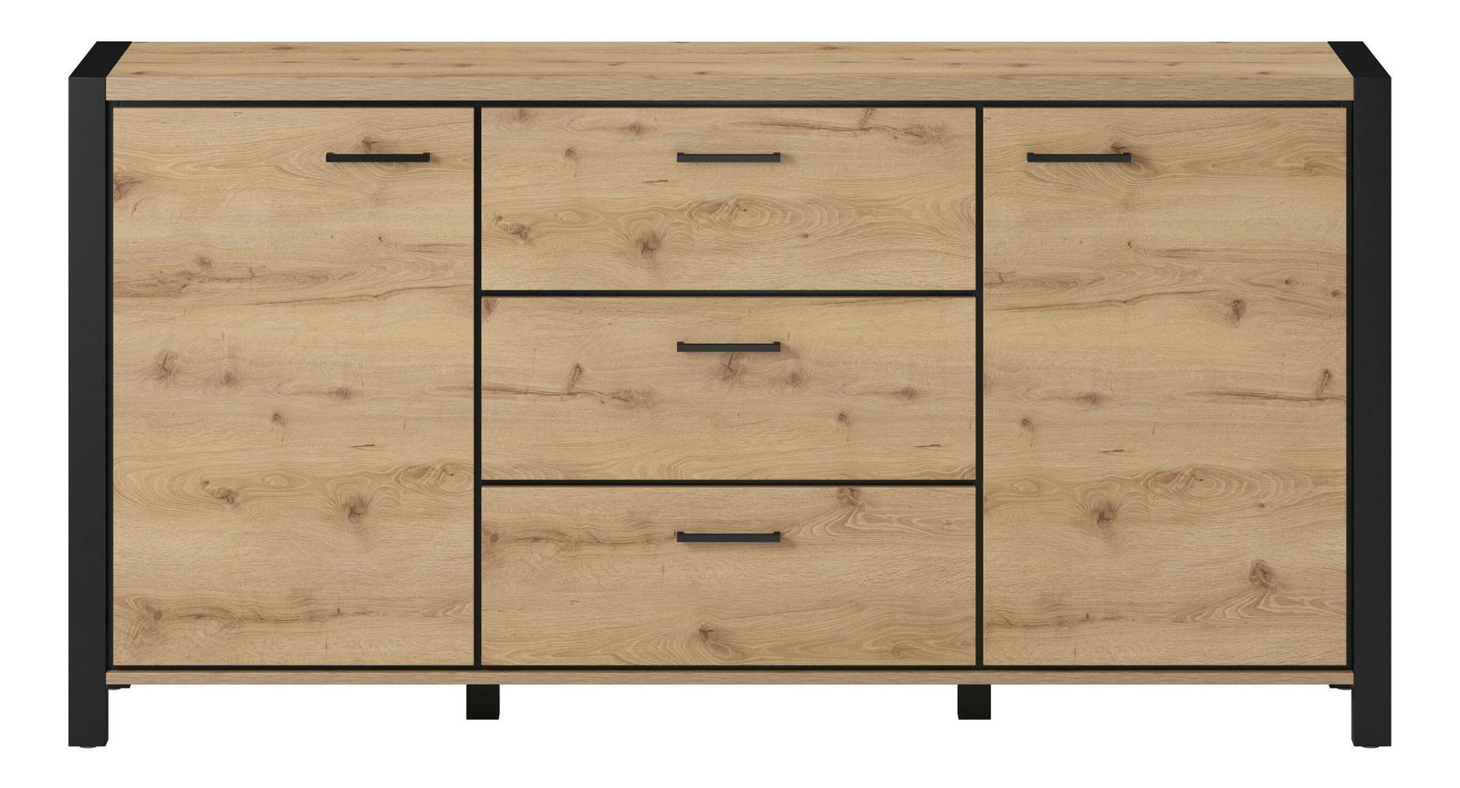 Prostorná komoda se zásuvkami a dvířky Armin vám pomůže uschovat mnoho věcí. Ve středu komody se nacházejí tři plně výsuvné zásuvky a po bocích jsou plná dvířka. Komoda je vyhotovena v příjemném dřevěném dekoru dub taurus s elegantním černým orámováním a nožičkami. Úchytky dvířek a zásuvek jsou úzké a také v černém provedení.
