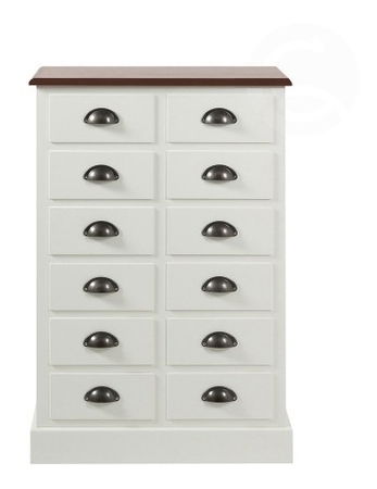Elegantní komoda se zásuvkami v rustikálním duchu. Tato komoda je vyrobena z masivního dřeva lakovaného bílou antickou barvou. Horní deska je antický dub. Úchyty jsou z kovu - patinované.