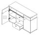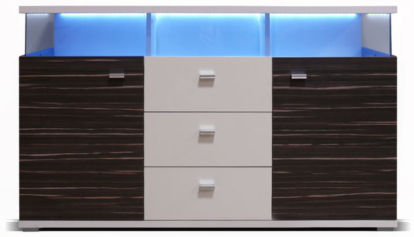Třídílná komoda se spoustou úložného prostoru s poličkami, který je uzavřen dvířky. Ve střední části jsou umístěny tři zásuvky. Horní část komody je prosklená a efektně podsvícená dodávaným LED osvětlením. To nejen zvýrazní předměty umístěny v ní, ale i navodí příjemnou atmosféru celého prostoru.