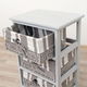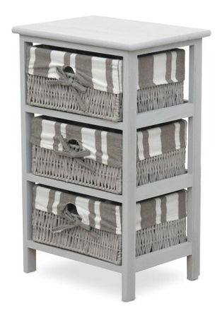 Pokud netušíte, kam uskladnit různé drobné předměty, tato komoda je přesně to, co potřebujete. Má pevný rám a tři proutěné zásuvky ozdobené mašlí a s pruhovým látkovým potahem. Zkrášlí vaše předsíně, obývací pokoje, ložnice nebo koupelny. Barevné provedení komody je šedá barva.