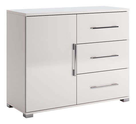 ZobrazitPraktická komoda Babylon_B17 vám poslouží pro uložení prádla, ale i triček a svetrů. Jedna část komody je tvořena třemi zásuvkami s tichým zavíráním a kuličkovým vedením. Druhá část komody má jedny dvířka a uvnitř je uprostřed předělena jednou policí. Komoda je bílé barvy a přední část je vyhotovena ve vysokém lesku. Komoda stojí na pěti stříbrných nožičkách. Dvířka a zásuvky mají elegantní podlouhlé stříbrné úchytky. Hrany nábytku jsou chráněny PVC a ABS hranou.