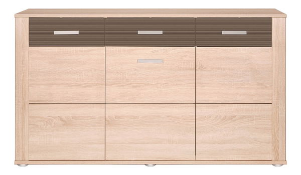 Krásná trojdílná komoda s dvířky na spodku a 3 zásuvkami nad nimi. Tenké vodorovné šedé úchyty a tenké minimalistické šedé nožičky dodávají styl. Tlumič dveří, který poskytuje jemné zavírání je v ceně produktu.