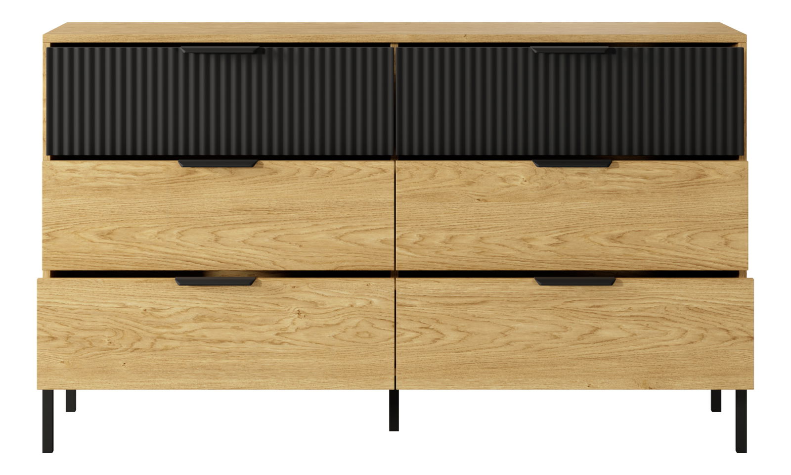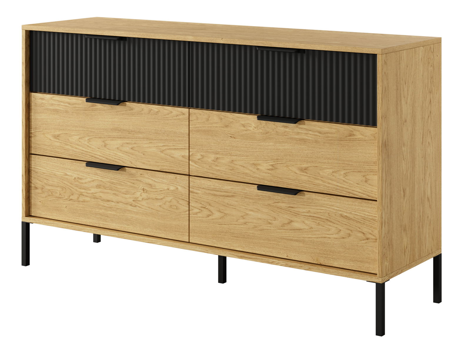 ZobrazitTato komoda představuje praktické a stylové řešení úložného prostoru pro váš interiér. Korpus i přední plochy jsou vyrobeny z laminované dřevotřísky E05, přičemž čelní plochy jsou doplněny o 18 mm MDF desku, která přidává na pevnosti a sofistikovaném vzhledu. Zadní deska v dekoru dub craft zlatý vnáší do nábytku teplý přírodní akcent. Komoda disponuje šesti šuplíky na kuličkových ložiskách s plným výsuvem, které umožňují pohodlný přístup k uloženým věcem. Všechny zásuvky jsou vybaveny systémem tichého zavírání, což zajišťuje komfort při každodenním používání a zároveň chrání materiál před opotřebením. Černé kovové úchyty a nohy dodávají komodě moderní charakter a eleganci, která skvěle zapadne do současných interiérů. Díky svému designu je univerzálním kusem nábytku vhodným do obývacího pokoje, ložnice či pracovny, kde kombinuje funkčnost s nadčasovou estetikou.