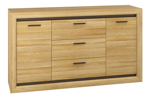 Praktická komoda se třemi prostornými zásuvkami a dvěma dvířky na bocích je ideálním kusem nábytku do kterého můžete uložit své oblečení, ale i nádobí. Barva amerického dubu přináší svěžest do každého interiéru, takže je určena pro osoby které ocení eleganci, přirozenost a jednoduchost. Dodává se v demontu.