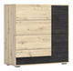 Moderní komoda s čistým designem, výška 90 cm, šířka 100 cm a hloubka 40 cm. Tato komoda s vnějšími i vnitřními částmi z 16 mm silné dřevotřísky je velmi robustní. ABS hrany o tloušťce 0,5 mm zajišťují perfektní olemování a zvyšují odolnost nábytku. Bezúchytkové otevírání zásuvek přidává komodě hladký a minimalistický vzhled, plastové nožičky zajišťují stabilní podporu. Komoda obsahuje čtyři zásuvky, což zaručuje dostatek místa pro uskladnění. Tento kus nábytku je ideální pro interiéry, které ocení jednoduchost a funkčnost.