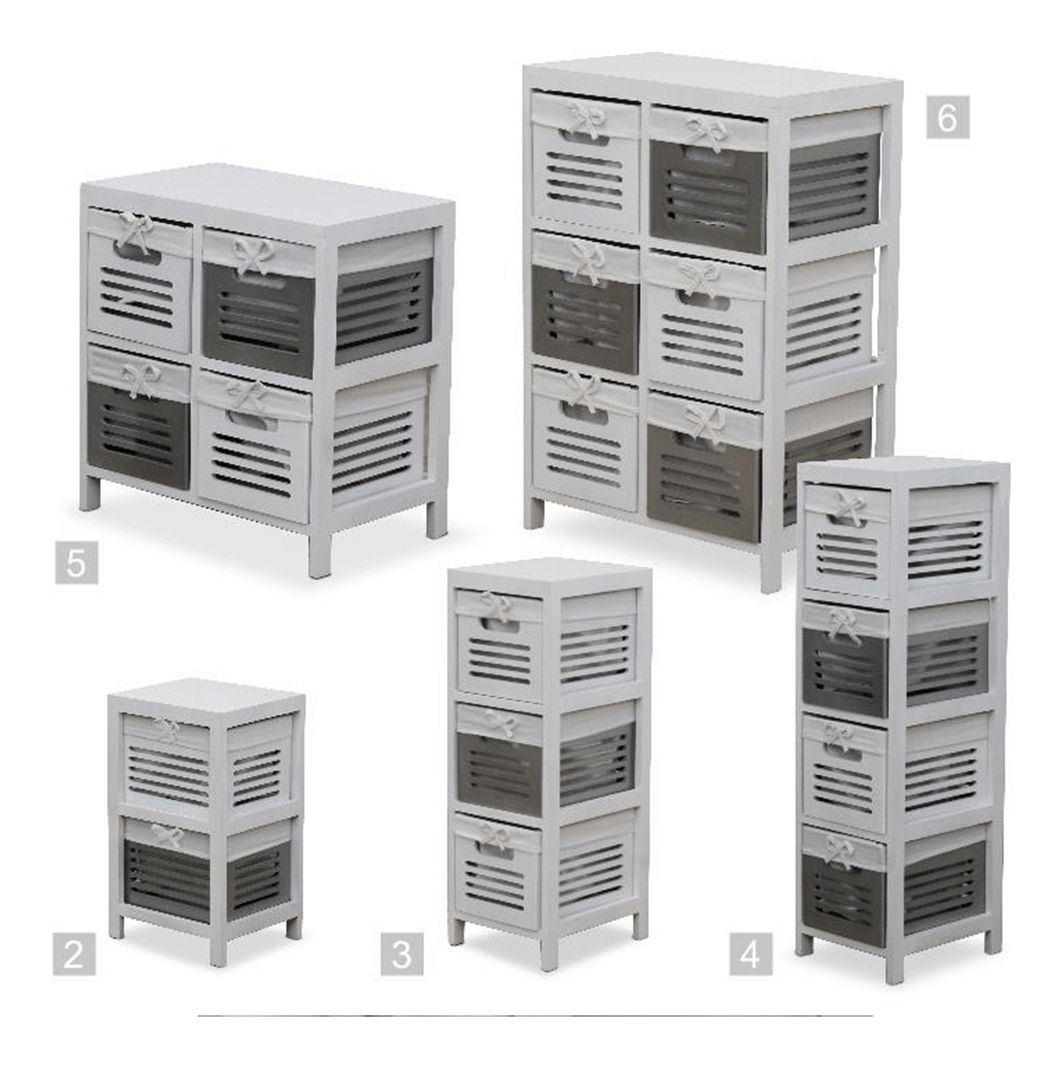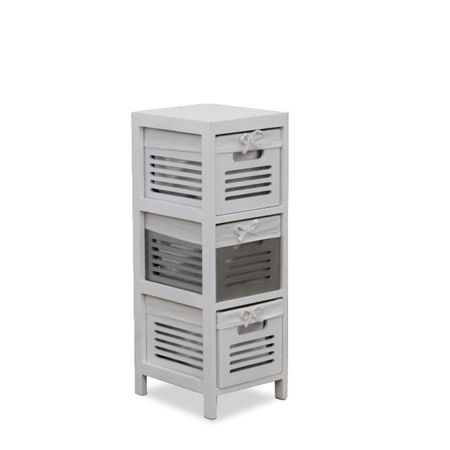 Stylová komoda univerzálního využití a pěkného designu. Dá se využít v předsíních, obývacích pokojích, studentských pokojích nebo i koupelnách. Skládá se ze tří zásuvek. Na zásuvkách jsou ozdobné mašličky. Komoda stojí na nožičkách. Barevné provedení komody je bílá barva v kombinaci s šedou.
