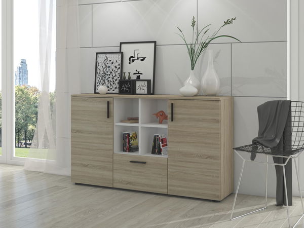 Jednoduchá komoda s bočními skříňkami a spodní zásuvkou potěší i otevřenými poličkami ideálními na různé dekorace. Zda bude umístěna v obývacím pokoji, ložnici nebo v pracovně určitě bude naplno využita.