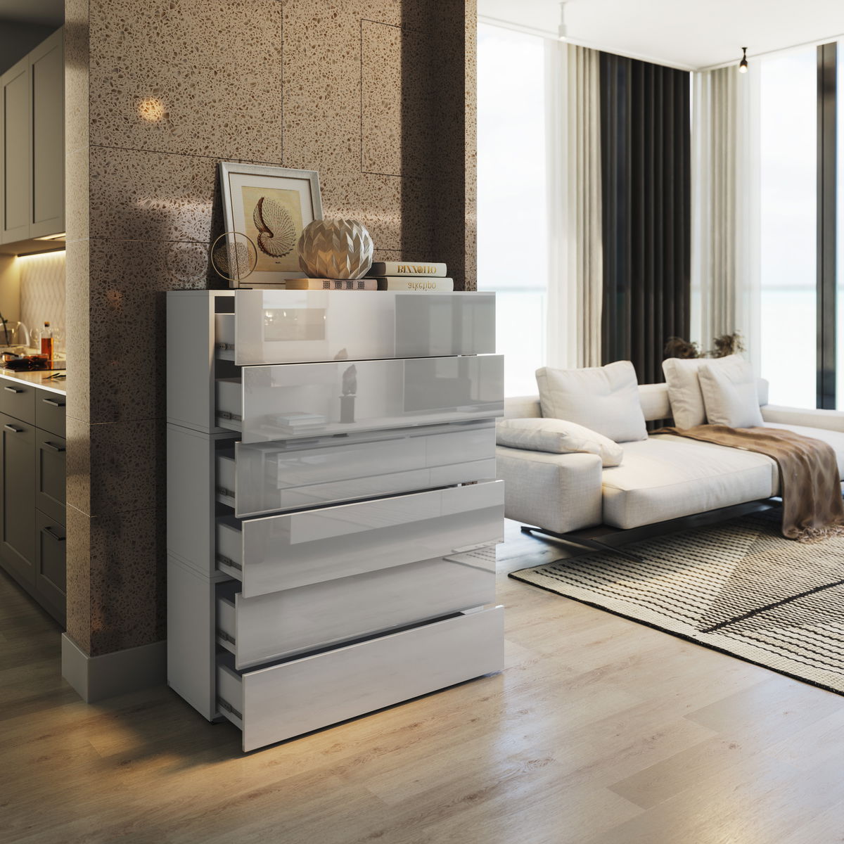 Komoda Berny 38 (bílá + bílý lesk) o výšce 120 cm a hloubce 38 cm je skvělým doplňkem do vaší obývací místnosti. S celkovým počtem 6 zásuvek poskytuje dostatek úložného prostoru pro odkládání věcí. Materiálem pro přední stěny zásuvek je MDF lakovaná deska a korpus je vyroben z dřevotřísky o tloušťce 16 mm. Komoda se otevírá pomocí systému PUSH TO OPEN. Na nohou se nacházejí stříbrné plastové nožičky o rozměrech 2 x 6 x 4 cm, které jsou součástí balení. Rozměr balení je 111 x 13,6 x 42,3 cm. Upozorňujeme, že pro tuto sestavu je třeba zakoupit 1 balík s 4 ks nožiček. Tato moderní bílá komoda s bílým leskem jistě zlepší funkčnost a design vašeho interiéru.