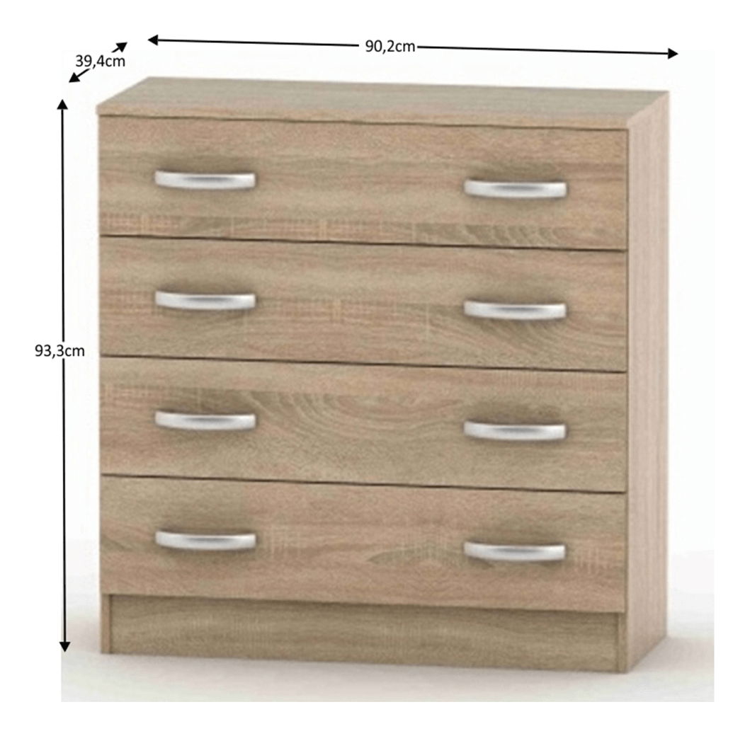 Komoda Breanna 2 BE02-007-00 je ideálním doplňkem do vašeho domova. S výškou 93,3 cm a hloubkou 39,4 cm nabízí dostatek úložného prostoru pro vaše věci. Materiál DTD laminovaná zajišťuje dlouhou životnost a odolnost. Komoda je vyrobena v provedení v dub sonoma barvě, která se hodí do různých interiérů. Technický popis zahrnuje 4 šuplíky, které jsou dostatečně velké pro uskladnění vašich věcí. Korpus má tloušťku 16 mm, což zajišťuje pevnost a stabilitu. Komoda je dodávána v demontu, což umožňuje snadnou montáž. S touto komodou bude váš domov praktický a elegantní.