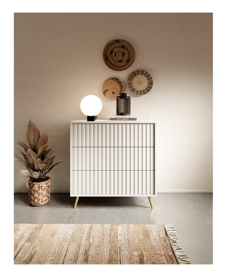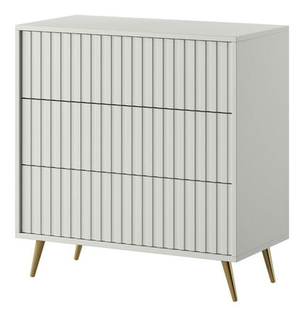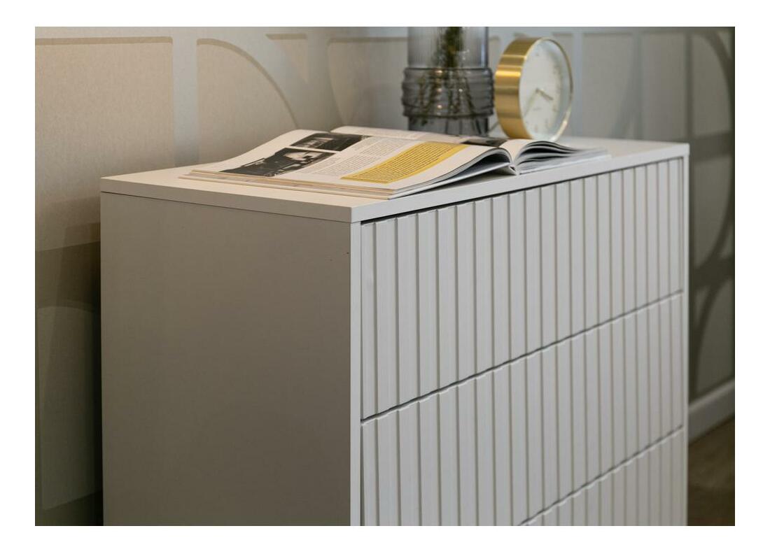 ZobrazitMáte rádi klasický nábytek s moderním nádechem svěžesti? Výběrem kolekce vnesete do svého interiéru elegantní, ale klasický vzhled Komoda bude skvělou volbou pro lidi, kteří potřebují spoustu úložného prostoru. Nábytek má tři prostorné odolné zásuvky, do kterých schováte všechny věci. Další výhodou je prostorná stolová deska, kde si můžete vystavit suvenýry z dlenky, fotografie vašich blízkých nebo sbírku malých sukulentů. Čelo má vkusný dekor v podobě lamel, dodávajících komodě originální vzhled Detaily produktu: korpus vyrobený z laminované desky Kronospan 190 PE o tloušťce 16 mm, přičemž čela jsou vyrobena z odolné MDF desky. ozdobné lamely, černé nohy o výšce 15 cm dodávají nábytku eleganci a usnadňují udržování pořádku, matné provedení čel a korpusu, plnovýsuvné zásuvky, maximální nosnost zásuvky: 5 kg, rozměry dna zásuvky - 71,7 cm x 32,7 cm, rozměry stran zásuvky : 33 cm x 14 cm, rozměry zadní části zásuvky: 70,6 cm x 14 cm, rozměry čela: 19,6 cm x 75,2 cm, nábytek pro svépomocnou montáž.
