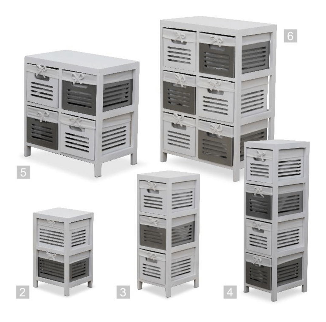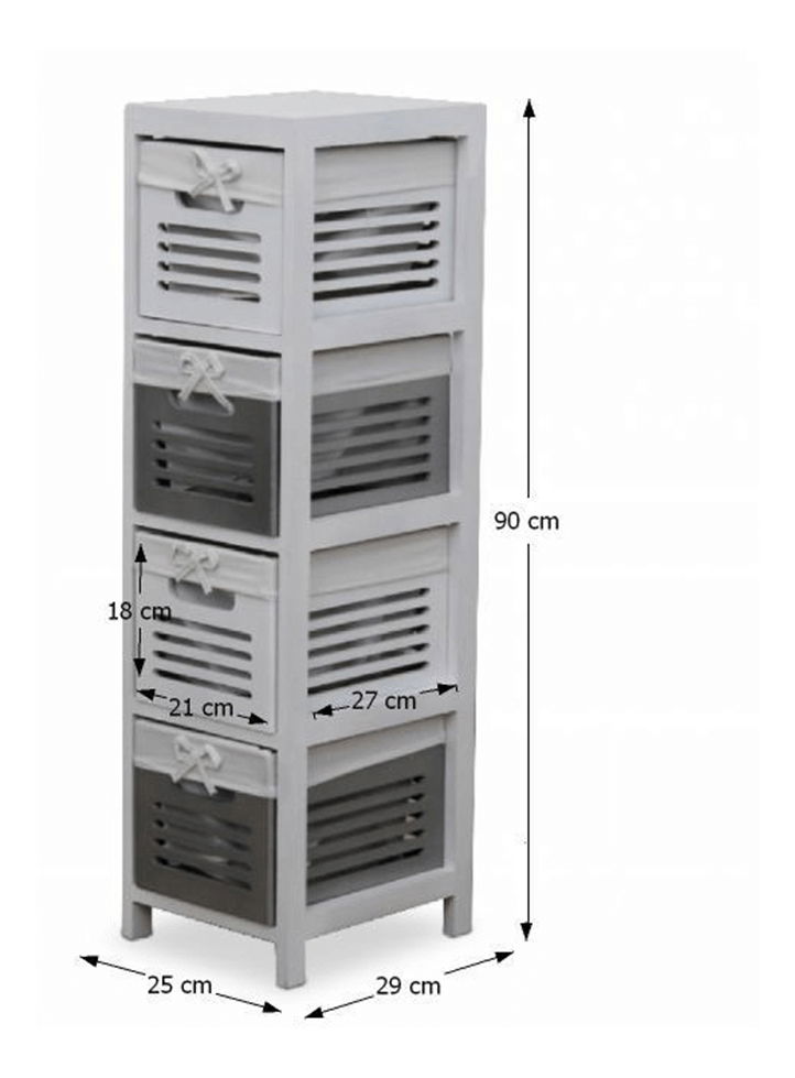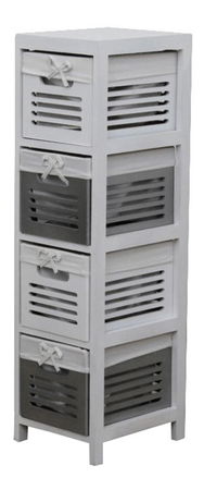 Stylová komoda univerzálního využití a pěkného designu. Dá se využít v předsíních, obývacích pokojích, studentských pokojích nebo i koupelnách. Skládá se ze čtyř zásuvek. Na zásuvkách jsou ozdobné mašličky. Komoda stojí na nožičkách. Barevné provedení komody je bílá barva v kombinaci s šedou.