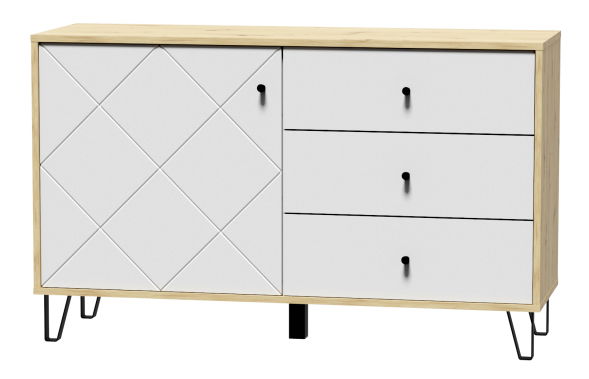 Vneste závan svěžesti a modernosti do svého obývacího pokoje v podobě světlého a moderního nábytku z kolekce BONNY. Dvoubarevná komoda s bílými šuplíky a dvířky s korpusem v barvě dub artisan prosvětlí každou místnost. Komoda má tři praktické šuplíky s plným výsuvem. Multifunkčnost doplňuje část s dvířky, za kterými je jedna police. Stylovost této komodě dodávají černé kovové úchyty a nožičky. Nábytek je vyroben z kvalitní dřevotřískové desky ošetřené ABS hranami.