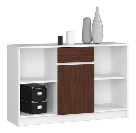 Díky modulární konstrukci komody ji můžete zkombinovat s jiným segmentem sestavy a vytvořit tak pohodlný rohový psací stůl. Skvěle poslouží také jako samostatný kus nábytku. Střední část komody tvoří jedna zásuvka a uzamykatelná dvířka umožňující snadné skladování. Kromě toho má čtyři samostatné, symetrické police s dostatkem prostoru pro vystavení. Komoda je dlouhá 120 cm a vysoká 77 cm, vyrobena z laminované desky. Komoda byla navržena tak, aby se hodila do většiny místností. Může být zajímavým prvkem výzdoby obývacího pokoje, poslouží jako funkční kus nábytku pro odkládání věcí v ložnici a lze jej použít i jako doplňkový kuchyňský segment. Díky neutrální barvě a minimalistickému designu se stane atraktivním a především funkčním doplňkem každého interiéru. Čela zásuvek a dvířek jsou vyrobena z laminované desky. Zásuvka se pohybuje na kovových válečkových vodítkách. Okraje pokryté ABS hranami zajišťují vysokou ochranu proti poškození. Možnost vytvoření sestavy - rohový psací stůl s psacím stolem Bahar. Dostupný ve více barevných provedeních.
