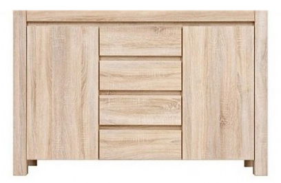 Komoda praktických rozměrů se čtyřmi zásuvkami a úložným prostorem po stranách s poličkou.