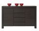 Komoda se čtyřmi zásuvkami a dvěma otevíracími dvířky v tmavém elegantním barevném provedení. Hodí se do obývacích pokojů, ložnic nebo jídelen.