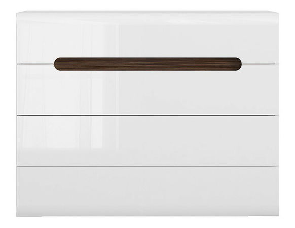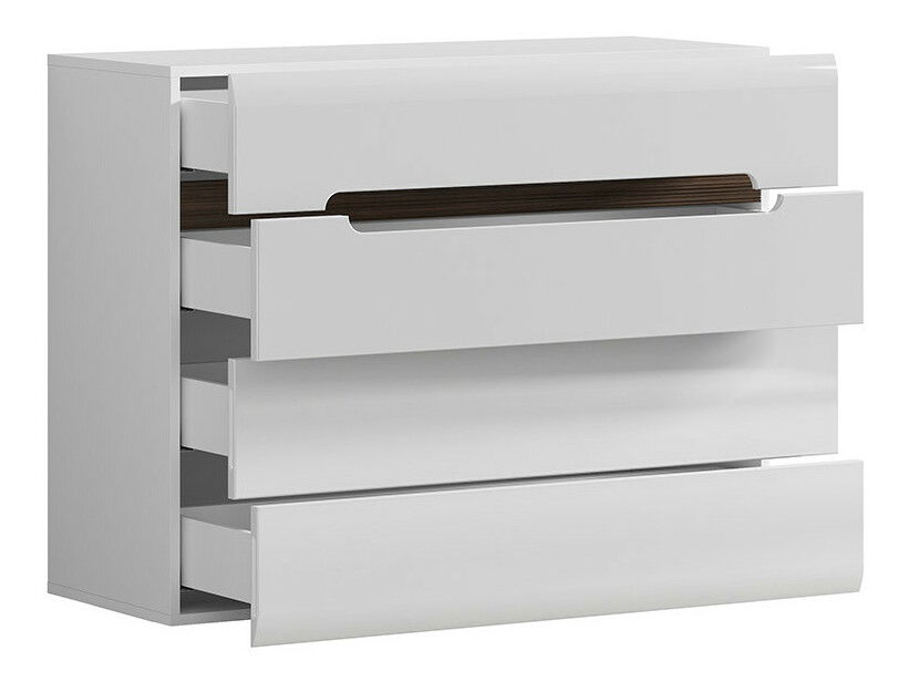 ZobrazitŠikovná komoda se čtyřmi zásuvkami se hodí zejména k odložení oblečení, či jiných doplňků. Komoda má příjemný moderní design a ozdobnou vložku. První dvě zásuvky mají úchyt na přední straně a dolní dvě zásuvky mají nenápadné úchyty po stranách zásuvky. Zásuvky mají tichý dojezd.