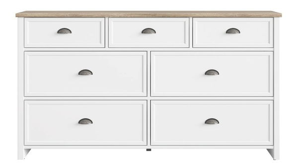 Prostorná komoda, která se dá využít i jako příborník. Design je v provensálském stylu s kovovými úchyty. Obsahuje sedm zásuvek.
