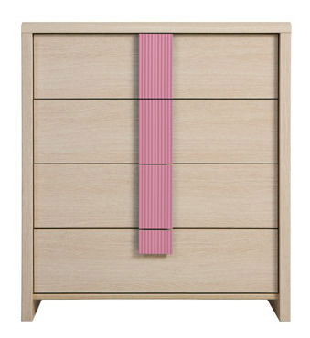 Komoda se čtyřmi zásuvkami v barvě dub jasný Belluno s výběrem dvou barev lištových úchytek: modrá, růžová.