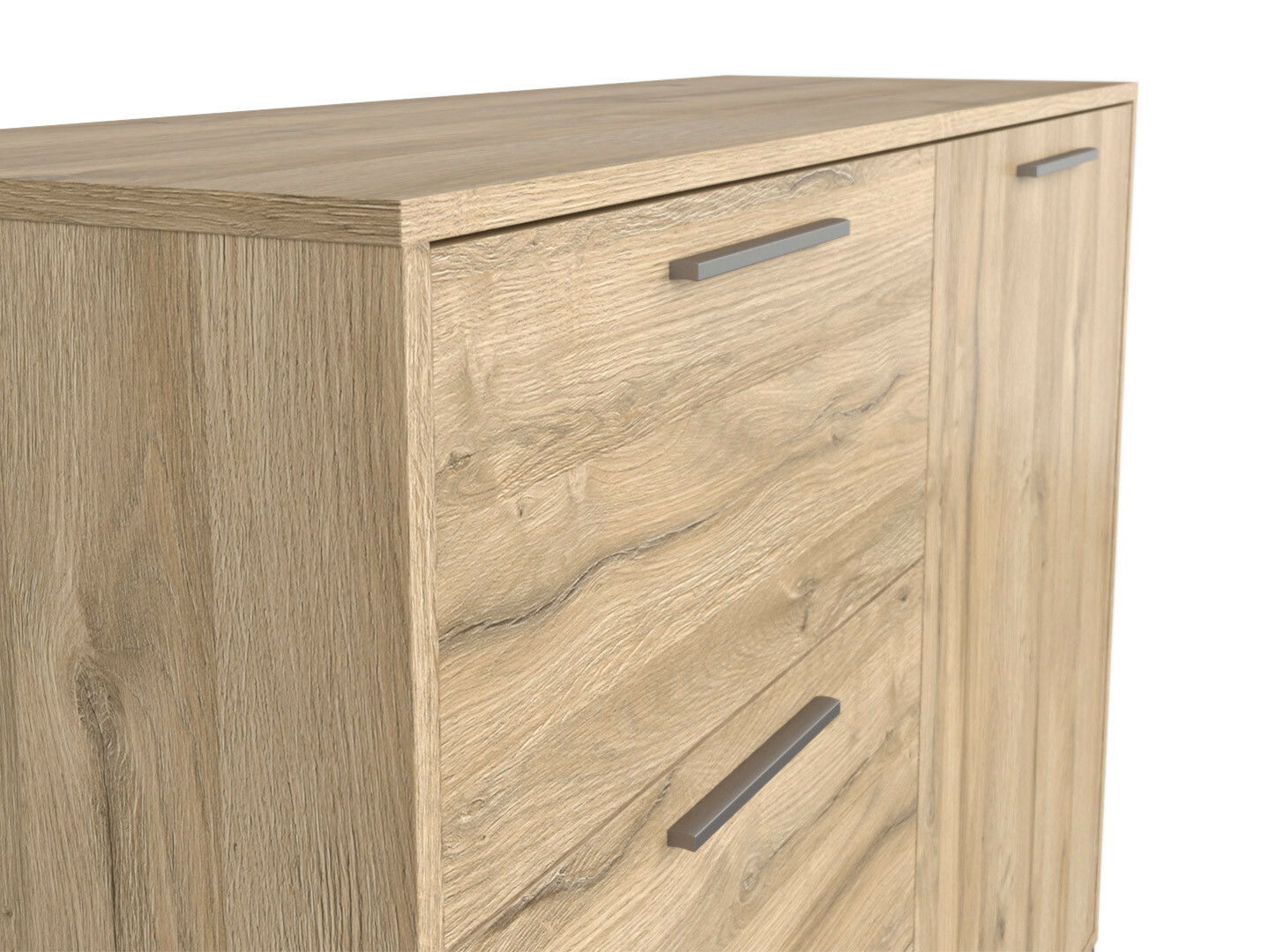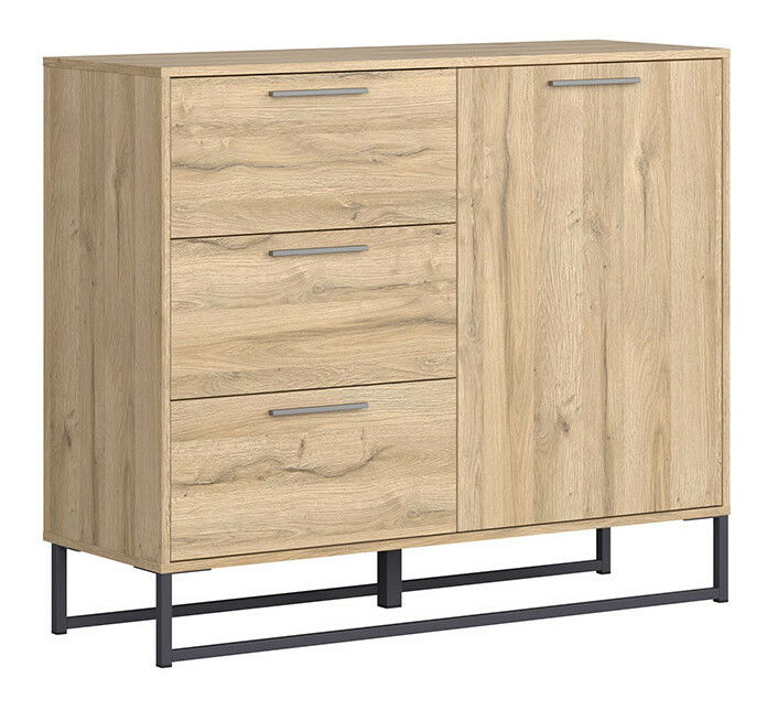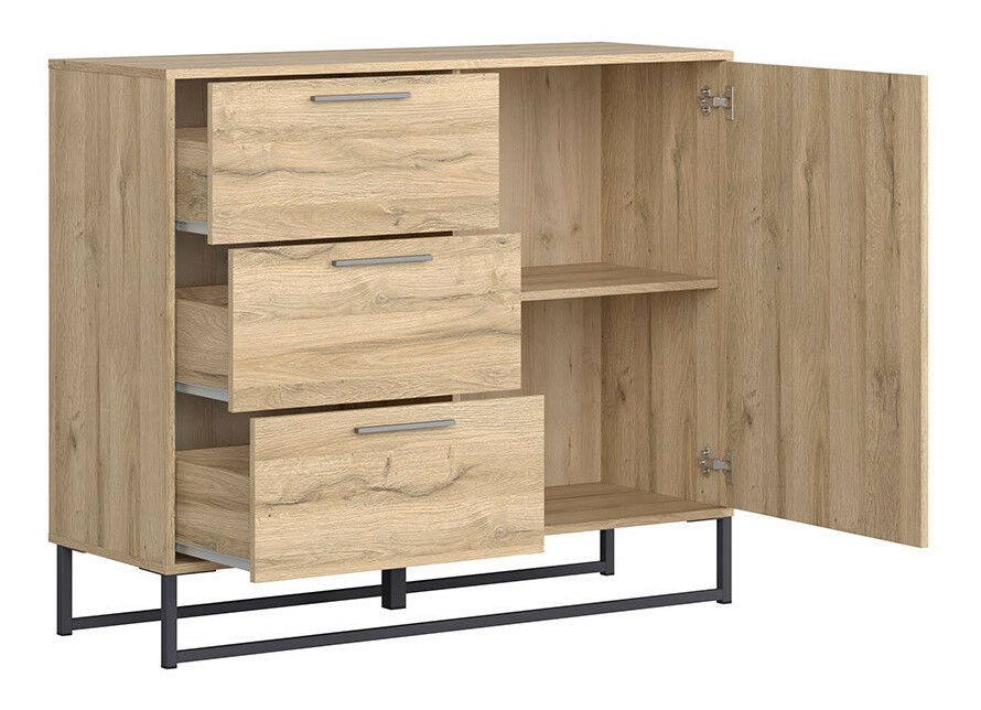 ZobrazitDesignově netradiční komoda, která stojí na kovové podstavě rozhodne ozvláštní Vaši domácnost. Poskytne Vám i úložný prostor pro jakékoliv Vaše doplňky a drobnosti. V její levé části se nacházejí tři zásuvky na válečkových kolejničkách a 1-dveřovou skříňku, která má uvnitř jednu polici. Komoda má závěsy s tichým dojezdem a s regulací brzdné síly.