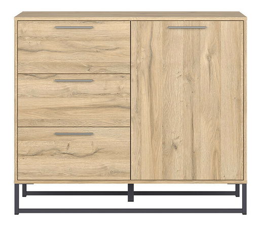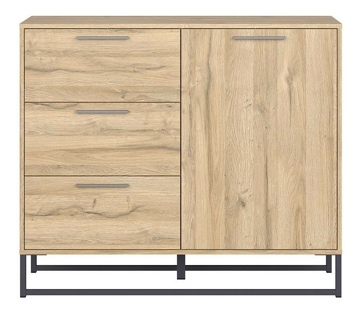 ZobrazitModerní dřevěná komoda z kolekce Gamla. Tato kolekce nabízí moderní zpracování a specifický design, která v kombinaci s přírodním dřevěným dekorem a syrovým kovem udržuje rovnováhu interiéru a poskytuje tak dokonalý komfort a úspornost. Komoda obsahuje 3 zásuvky na válečkových kolejničkách a 1-dveřovou skříňku s 1 policí uvnitř. Závěsy s tichým dojezdem, s regulací brzdné síly.