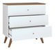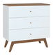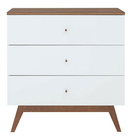 Kam s oblečením, doplňky a drobnostmi? Jednoduše je umístíte do této krásné komody se třemi zásuvkami. Komoda stojí na dřevěných nožkách. Zásuvky mají drobné dřevěné úchyty.