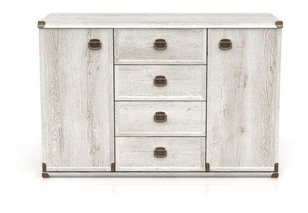 Stylová komoda z modelové řady Indiana je vhodná do dětských a studentských pokojů. Svým barevným provedením, okovanými rohy a masivními kovovými úchyty navozuje atmosféru divokého západu. Má dvířka na pravé a levé straně a čtyři praktické zásuvky uprostřed.