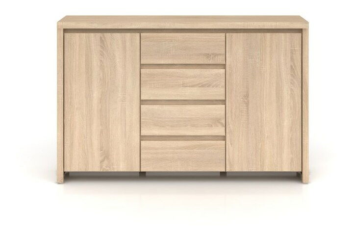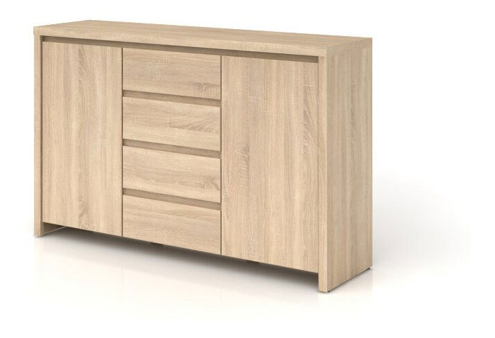 Stylová komoda moderního designu zaujme už na první pohled svým čistým stylem a absencí úchytů na dvířkách a zásuvkách. Komoda je velmi vhodná do moderně zařízených obývacích pokojů, předsíní, ložnic nebo pracoven. Na obou stranách komody jsou dvířka a uprostřed se nacházejí čtyři zásuvky. Komoda stojí na menších nožičkách.