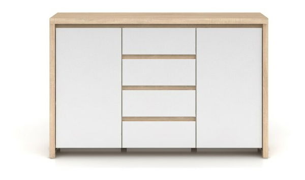 Stylová komoda moderního designu zaujme už na první pohled svým čistým stylem a absencí úchytů na dvířkách a zásuvkách. Komoda je velmi vhodná do moderně zařízených obývacích pokojů, předsíní, ložnic nebo pracoven. Na obou stranách komody jsou dvířka a uprostřed se nacházejí čtyři zásuvky. Komoda stojí na menších nožičkách.