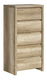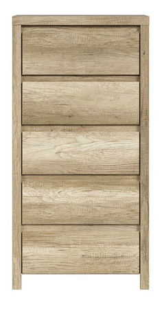 Úzká komoda s pěti praktickými zásuvkami. Osloví vás zejména čistým a minimalistickým designem, který se výborně hodí do moderně zařízených interiérů. Poskytne vám dostatek úložného prostoru pro všechny drobnosti a doplňky. Zásuvky mají zkosené horní hrany pomocí kterých se otevírají.