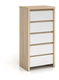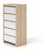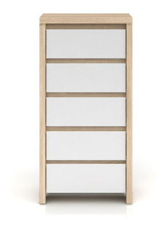 Úzká komoda s pěti praktickými zásuvkami. Osloví vás zejména čistým a minimalistickým designem, který se výborně hodí do moderně zařízených interiérů. Poskytne vám dostatek úložného prostoru pro všechny drobnosti a doplňky. Zásuvky mají zkosené horní hrany pomocí kterých se otevírají.