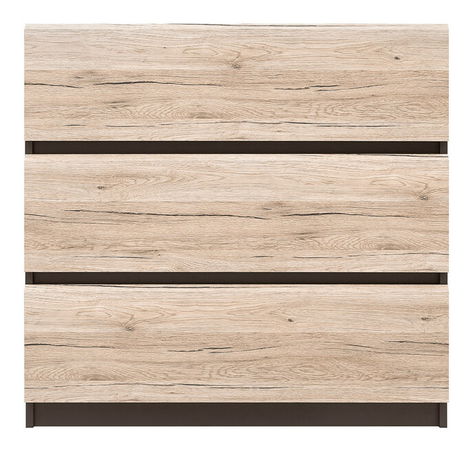 Širší komoda se třemi zásuvkami. Zaujme vás příjemným barevným provedením a zásuvkami se zkosenými horními hranami a bez úchytů. Je vhodná na jakékoliv vaše doplňky a zútulní prostory vašich obývacích pokojů, předsíní a ložnic.