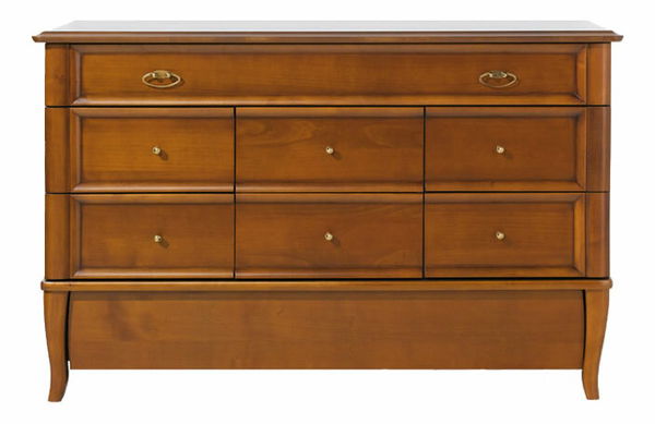Luxus a eleganci vdechnete vaším domácnostem prostřednictvím této krásné komody. Kromě jejího přitažlivého starožitného designu vás osloví i dostatkem úložného prostoru, který vám nabízí. Má jednu široké zásuvky ve vrchní části a spodní části a šest menších zásuvek v prostřední části. Zásuvky mají ozdobné kovové úchyty.