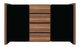 Dvoudveřová komoda se čtyřmi zásuvkami. Dvířka, lesklé černé a zásuvky v barvě ořech Merano.