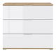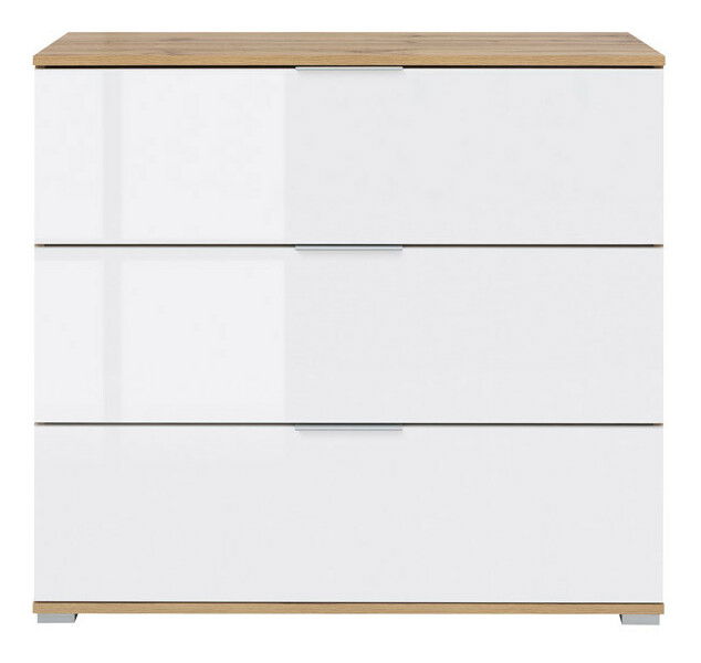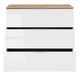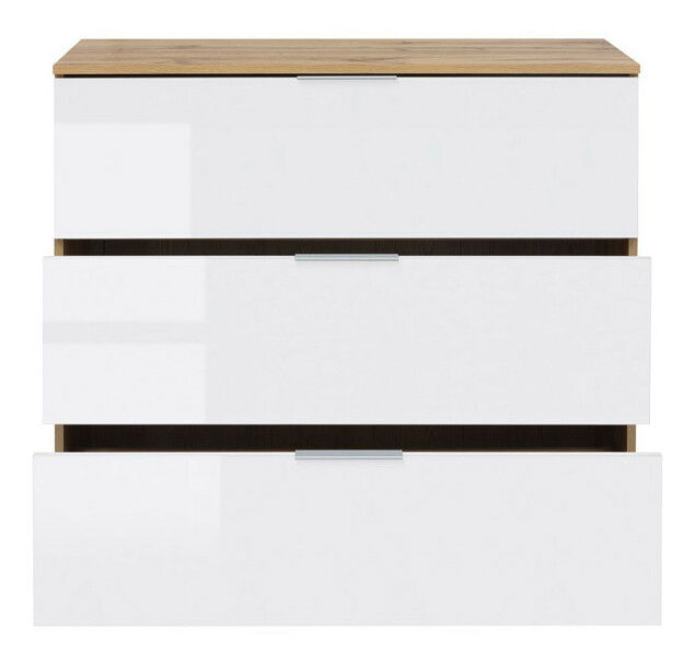 ZobrazitPotřebujete prostor pro prádlo, oblečení a další doplňky? Šikovná komoda se třemi šuplíky se stane oblíbeným doplňkem vaší ložnice, obývacího pokoje či předsíně. Příjemné barevné provedení dubu wotan v kombinaci s bílým leskem a všestranný design se hodí do jakýchkoli interiérů. Zásuvky mají nenápadné podlouhlé úchyty. Minimalistické linie zdůrazňují charakter nábytku, který vytvoří dokonalou atmosféru domácnosti. Každá zásuvka má nosnost maximálně 4 kilogramy.