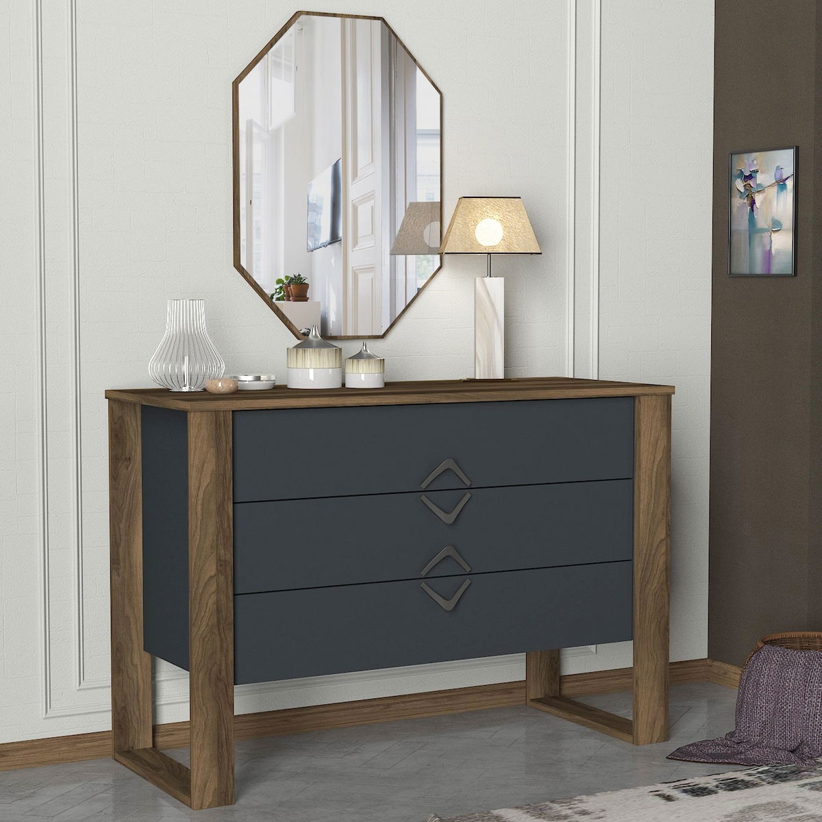 ZobrazitKomoda – Bumba je moderní nábytek, který je ideální do vašeho interiéru. S výškou 76 cm, šířkou 110 cm a hloubkou 44 cm je dostatečně velká pro uskladnění vašich věcí. Je vyrobena z kvalitního materiálu, který zaručuje dlouhou životnost a odolnost. S kombinací barev Ořech a Antracit působí tato komoda elegantně a stylově. Je vybavena praktickými zásuvkami a poličkami, což vám umožňuje udržet pořádek a uspořádat věci dle vašich potřeb. Svým moderním designem a funkčností je komoda – Bumba skvělým doplňkem vašeho domova.