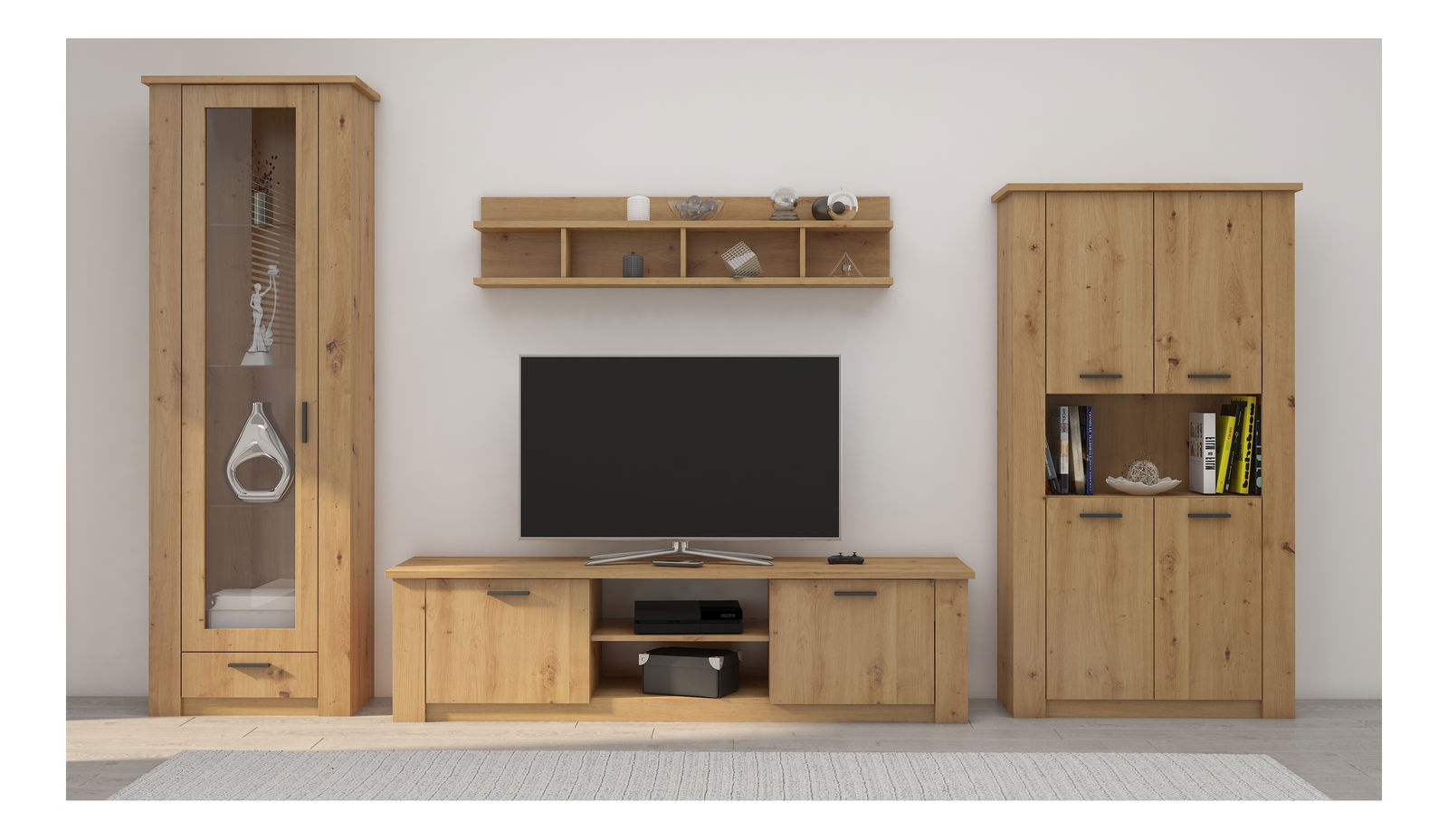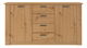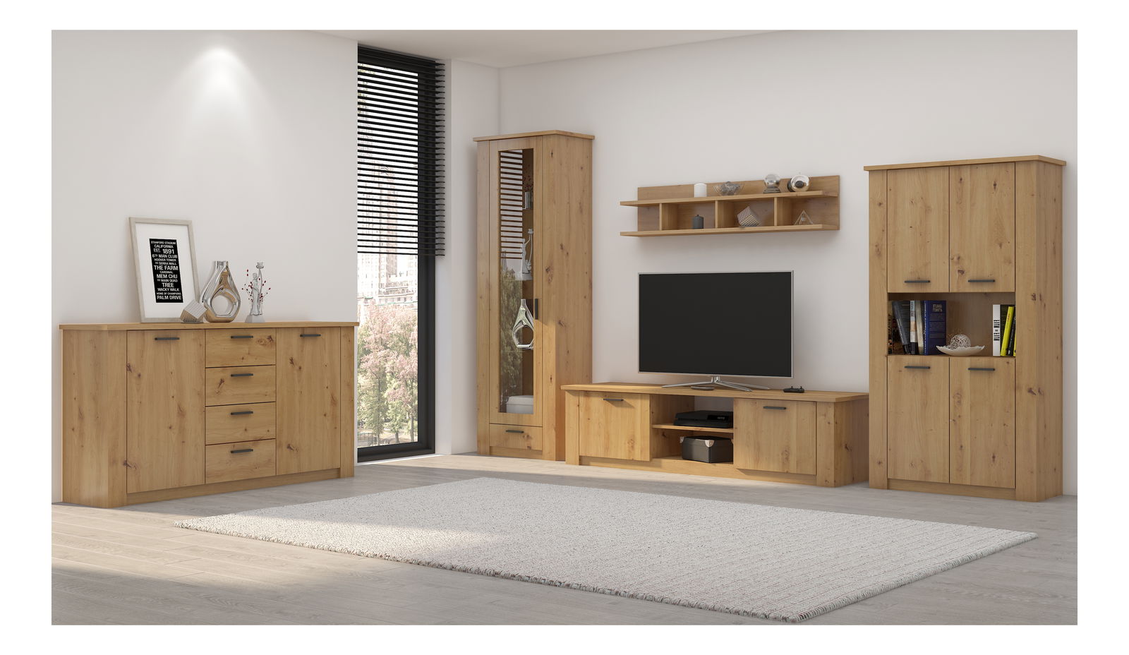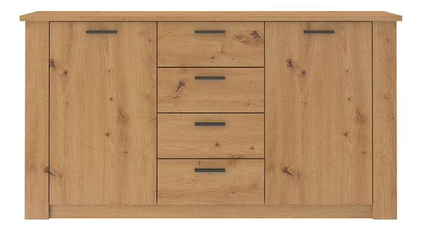 Široká komoda Colombo je multifunkčním nábytkem do obývacího pokoje, případně do jídelny. Díky tomu, že nemá jen zásuvky, ale také boční skříňky je nepostradatelným prvkem v bytě. Nábytek je vyroben v přírodním dekoru dub artisan doplněný o černé plastové úchytky.