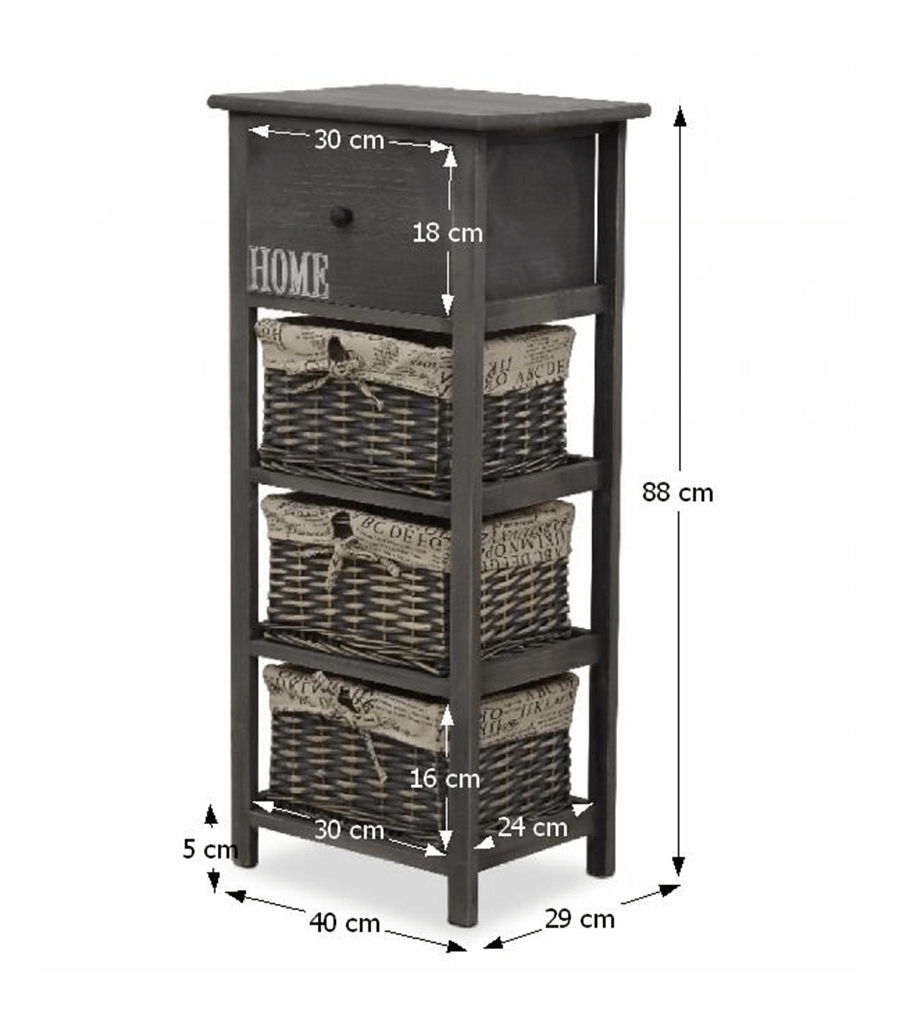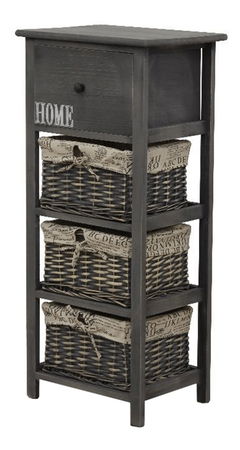 Tuto komodu ocení zejména milovníci tradičního rustikálního stylu a přírodních materiálů. Dá se využít nejen v předsíni, ale hodí se i do obývacích pokojů, nebo ložnic jako noční stolek. Má jednu zásuvku a tři proutěné košíky na odkládání drobných předmětů. Barevné provedení komody je šedohnědá.