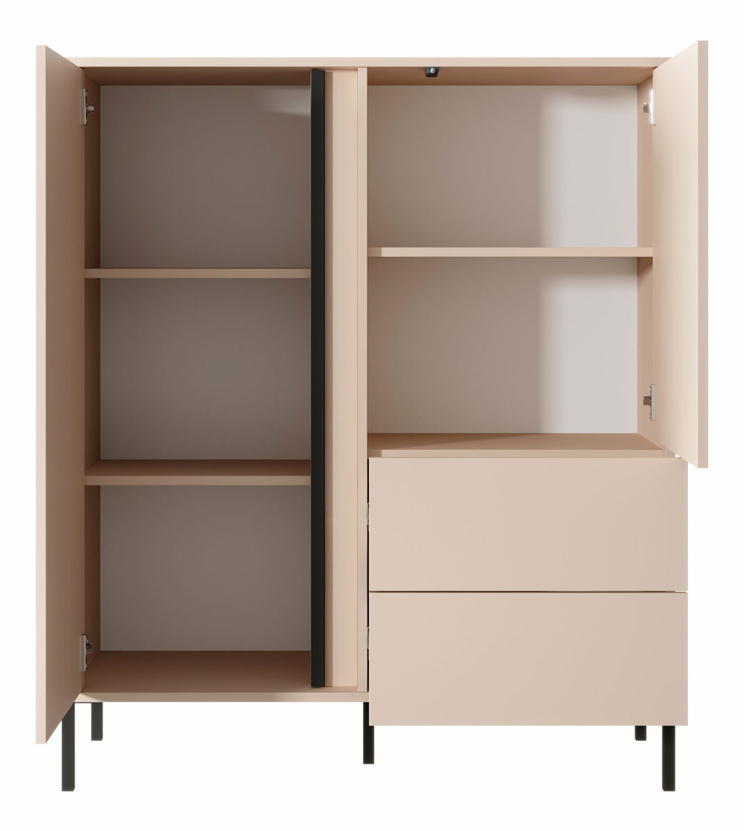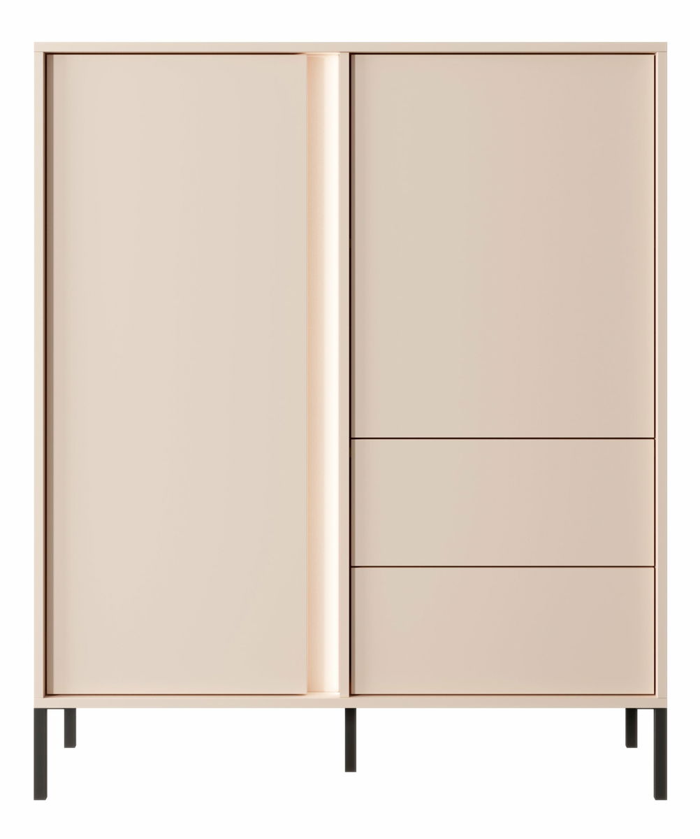 Kolekce DANTON se vyznačuje lehkostí a elegancí. Je to díky jejímu geometrickému tvaru a zajímavému vertikálnímu LED podsvícení ve výklencích, které dokonale ladí s jemnou béžovou barvou a prolamovanými černými kovovými nohami. To vytváří nekonečné možnosti designu. Tato kombinace rozzáří každý obývací pokoj a opticky jej zvětší. Nábytek má systém otevírání dvířek push-to-open.