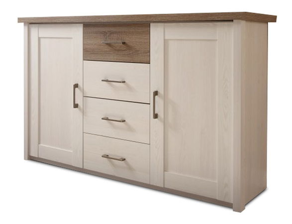 Komoda Dawa (bílá + dub sonoma) o výšce 90 cm a hloubce 42 cm je elegantním nábytkem, který má tři části. Pravá a levá část jsou vybavena dveřmi a uvnitř poskytují úložný prostor. Střední část obsahuje čtyři zásuvky, které umožňují snadné ukládání věcí. Komodu dodáváme v demontu. Materiál korpusu je DTD foliovaná a tloušťka materiálu je 18/36 mm. Barva je dub sonoma truflový nebo pinie bílá. Rozměry jsou 150x42x90 cm. Tato komoda je ideální pro ty, kdo hledají praktické a zároveň elegantní řešení pro svůj domov.