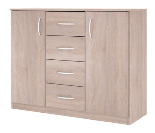 Komoda se čtyřmi úzkými zásuvkami a dvěma dvířky.