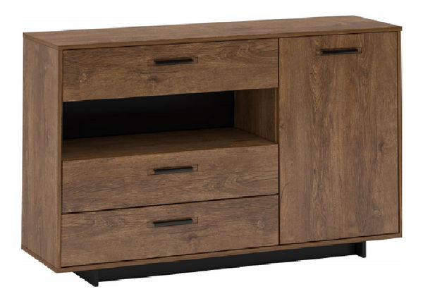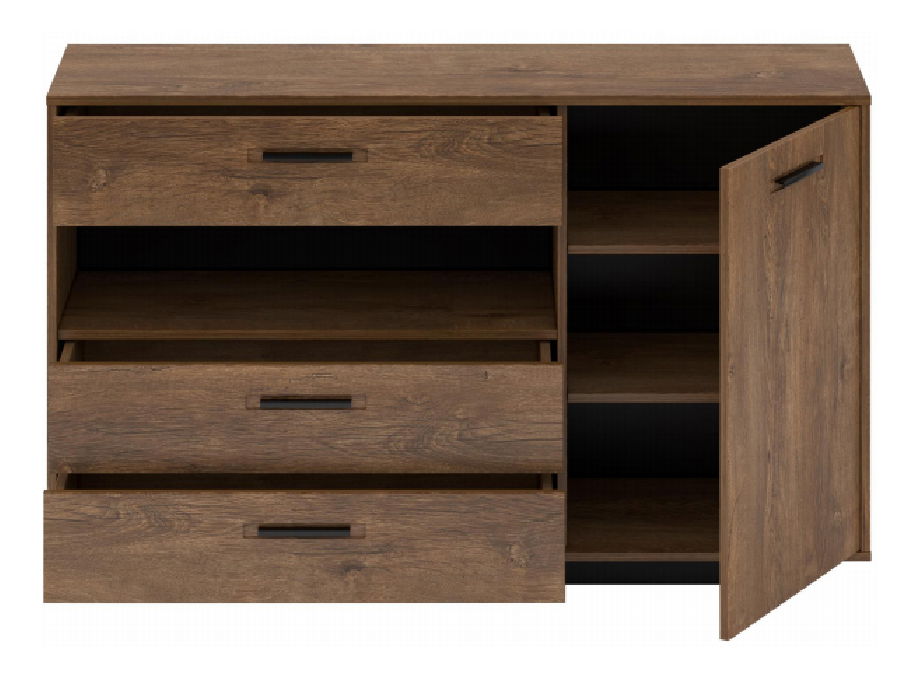 Komoda Diram E (dub bolzano + černá) je praktický a moderní nábytek, který se skvěle hodí do vašeho interiéru. S výškou 86,2 cm a hloubkou 40 cm nabízí dostatek místa pro uskladnění vašich věcí. Materiál laminovaná DTD/MDF o tloušťce materiálu 16 mm zajistí dlouhou životnost a odolnost komody. Ve spodním prostoru, umístěném 5 cm od podlahy, se nachází otevřený úložný prostor, který můžete využít k uskladnění větších předmětů. Komoda má také 3 zásuvky, ve kterých můžete uložit menší předměty. Na podstavci se nachází kovová úchytka, která dodává komodě moderní vzhled. Ve skříňce se nacházejí poličky pro lepší organizaci vašich věcí. Tato komoda je vyrobena z kvalitních materiálů a je ideálním řešením pro váš domácí interiér.