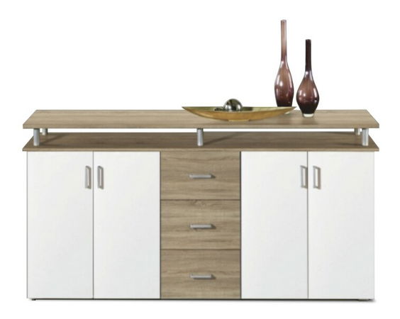 Rozměrná trendová komoda, která umí potěšit oko v každé místnosti. Vybavena je horní deskou v provedení dub sonoma, která stojí na šedých nožičkách na vrchu komody. Po obou stranách se nacházejí 2 dvířka a uprostřed se nacházejí 3 zásuvky. Šedé úchyty, materiál je DTD laminovaná.