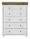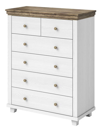 Komoda Elvina S Typ 45 (bílý popel + dub lefkas) o výšce 113 cm a hloubce 42 cm v Abisko jasan (bílá) + dub lefkas, je designový a praktický kousek z kolekce Elvina. Tento nábytek se hodí do ložnic, obývacích pokojů a moderní kanceláře. Komoda má šest šuplíků, které vám pomohou udržovat vaše věci v pořádku. Materiál, ze kterého je vyrobena, je foliovaná dřevotříska, plastové úchyty a laminovaná deska (15 mm) + foliovaná deska (28 mm) na vrchní straně. Dolní deska je vyrobena z foliované desky (38 mm), boční strany z foliované desky (15 mm) a zadní strana z HDF (3 mm). Materiál zásuvek je foliovaná deska (18 mm). Vedení zásuvek je kuličkové a tichý dojezd je ano. Tato komoda je dokonalým doplňkem pro váš domov.