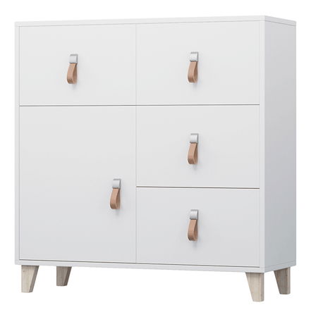 Komoda Famira 4S1D (bílá) je vynikajícím doplňkem do jakéhokoli interiéru, jelikož její stylová konstrukce poskytuje dostatek úložného prostoru pro ukládání věcí v každé místnosti. Tato komoda má úzkou konstrukci a je vybavena 4 až 5 zásuvkami a dvířky, tím pádem se hodí pro ukládání oblečení, knih a jiných předmětů. Je vyrobena z DTD laminovaného materiálu o tloušťce 16 mm a bílá barva dodává místnosti svěží a příjemný vzhled. Kožené úchytky přidávají komodě moderní a elegantní nádech, což ji činí vhodnou nejen do ložnic a obývacích pokojů, ale také do kanceláří a pracoven. Komoda má vlastní dřevěné nožičky a výšku spodního prostoru od podlahy 15 cm. S touto komodou získáte nejen praktický, ale také stylový kus nábytku, který bude skvělým doplňkem pro vaši místnost.